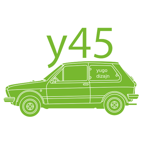 This features a green car with the number 45 on it. It is a Yugo design, which is an old-fashioned vehicle model. The car has a distinctive shape and color, making it stand out in the scene. The car's design suggests that it may be from a different era or possibly a vintage model.