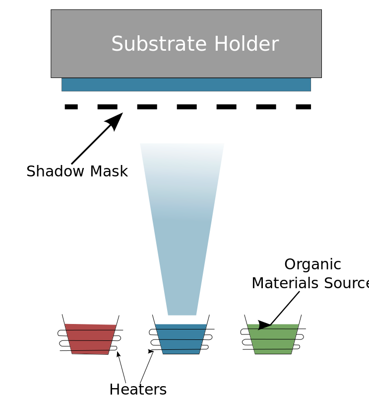 This is a diagram that shows the process of making a shadow mask. It starts with a blue background and then moves on to show the different stages of creating the mask, including the use of organic materials as sources for the mask. There are several arrows pointing out the various steps in the process, such as using heaters to create the desired shape. The diagram is labeled with text describing each step, making it easy to understand and follow along.