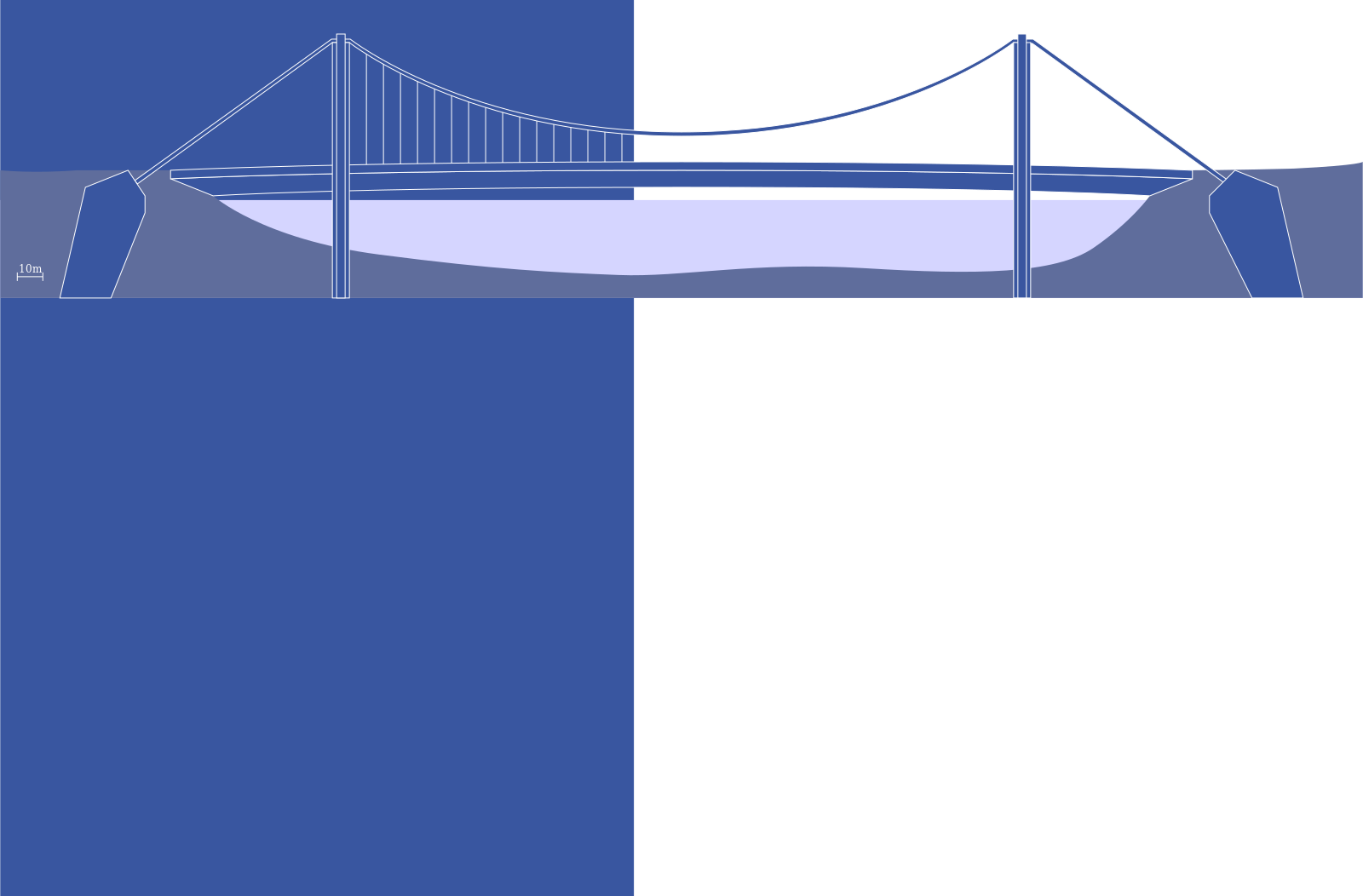 This is a blue and white painting of a bridge. It features a large, arched structure with a purple waterway beneath it. The bridge spans across the entire width of the scene, creating an impressive visual effect. The colors used in this artwork are predominantly shades of blue and white, giving the image a clean and elegant appearance.