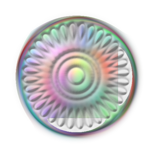This features a round, colorful object with a hole in the center. It appears to be made of glass or plastic and has an iridescent quality that gives it a rainbow-like appearance. The colors are vibrant and varied, making the object visually striking. The central hole adds depth and interest to the overall design of the piece. This unique item could serve as a decorative piece or even a functional object for everyday use.