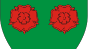 This features a coat of arms with two red flowers, one on the left and another on the right. These flowers are surrounded by green leaves, creating an eye-catching design. The coat of arms is displayed prominently in the center of the image, drawing attention to its unique and intricate details.
