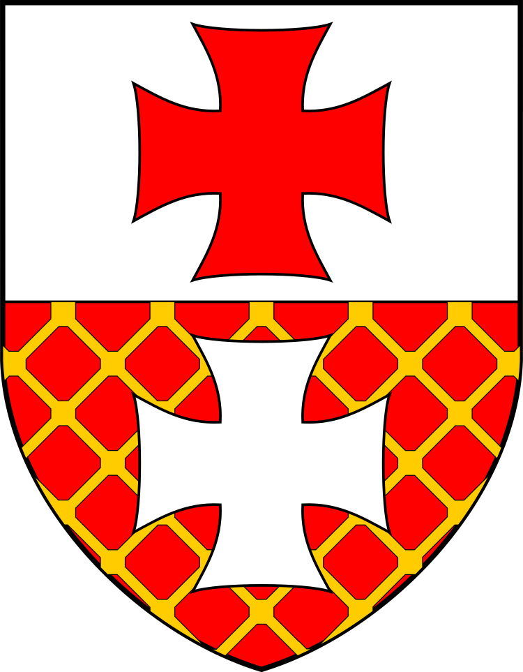 This features a coat of arms with a red and yellow background. The design is adorned with a cross, which is the central element of the crest. The cross has a yellow outline, making it stand out against the red background. This coat of arms appears to be an emblem or symbol for a specific organization or entity.