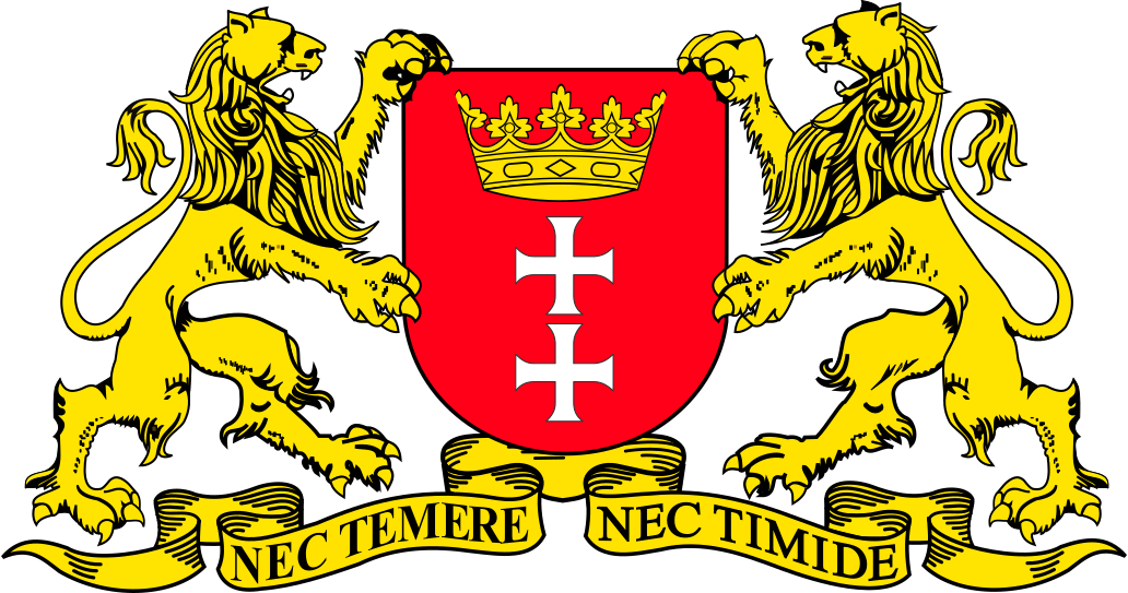 This features a coat of arms for the city of Gdansk, Poland. The coat of arms is adorned with two lions and a red background. The lions are positioned on either side of the shield, while the red background serves as a striking contrast to the rest of the design. This emblem represents the city's heritage and identity, showcasing its rich history and cultural significance.