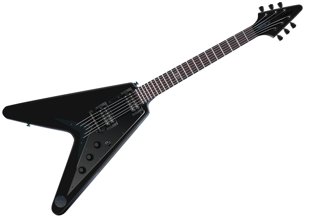 This features a black Flying V guitar, which is an iconic design with its distinctive shape and pointed headstock. This particular guitar has six strings, making it suitable for various musical genres such as rock, blues, or jazz. The neck of the guitar is made from wood, adding to its overall quality and durability. The guitar's body is black in color, giving it a sleek and modern appearance. Overall, this image showcases an impressive piece of musical equipment that can be used by musicians for creating beautiful melodies and rhythms.