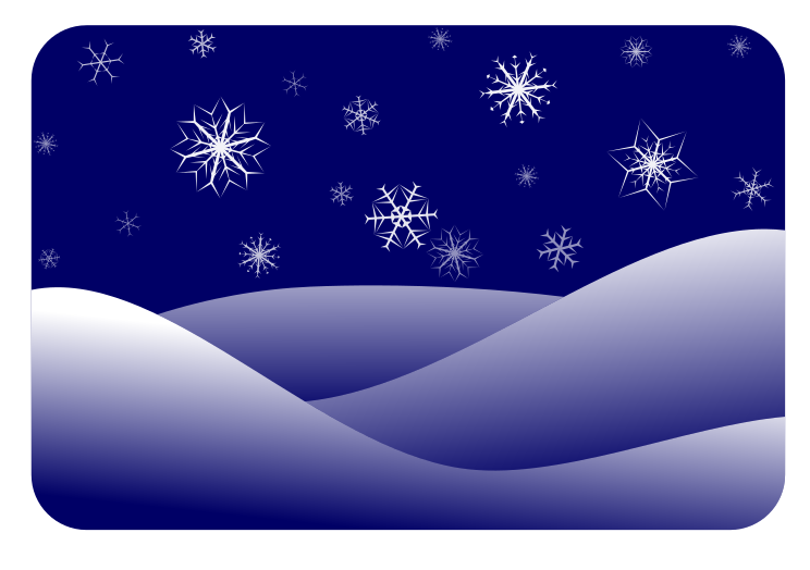 This features a beautiful winter scene with snow-covered hills and mountains under a dark blue sky. The sky is filled with numerous white snowflakes, creating a serene atmosphere. The snowy landscape stretches across the entire frame of the picture, giving an impression of vastness. The combination of the snowy hills, the dark blue sky, and the falling snow creates a captivating winter scene that evokes feelings of tranquility and wonder.