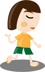 This features a cartoon girl with short hair, wearing green and yellow clothing. She is walking on the street while making a funny face. Her arms are outstretched as she moves forward, giving her an energetic appearance. The girl's facial expression suggests that she might be enjoying herself or engaging in playful behavior.