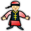This features a cartoon-like character wearing a red and black outfit, with a yellow symbol on the front. The character appears to be a young boy or a man dressed in traditional Chinese clothing. The outfit includes a hat, which is placed atop the character's head. The overall appearance of the image gives off a vibrant and colorful vibe, making it an interesting visual representation of Asian culture.
