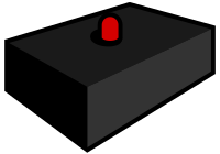 This features a black box with a red button on top of it. The box appears to be a small electronic device, possibly a power supply or an amplifier. The red button is located towards the center of the box and stands out against its dark background. The overall appearance of the box suggests that it may be used for various electronic purposes or as a decorative piece in a room.