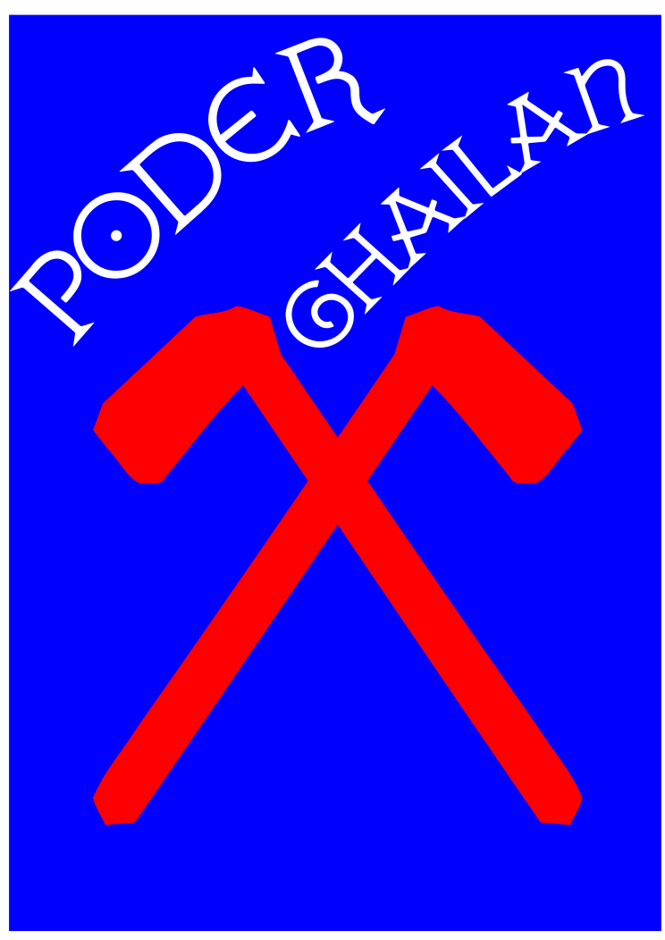 This features a blue and red logo with the word "Poder" written in white. Below this, there is another word that reads "Ghailan." This design appears to be an advertisement or promotional material for something related to Ghailan. The colors of the logo are striking, making it stand out against a blue background.