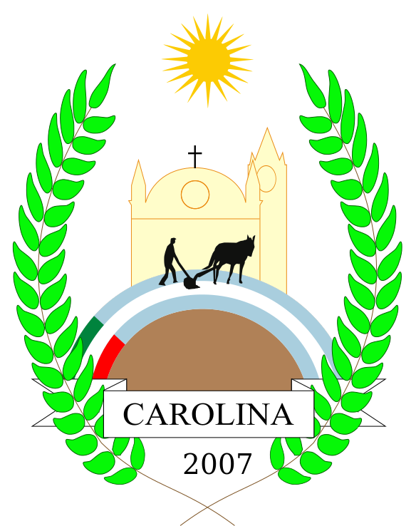 This features a logo for the city of Carolina, which is located in the province of Corrientes. The logo consists of an emblem with a cross and a sun, along with several green leaves surrounding it. In the center of the emblem, there is a man pulling a plow, symbolizing agriculture and hard work. The year 2007 can be seen in the bottom right corner of the image, indicating that this logo was created during that time period.