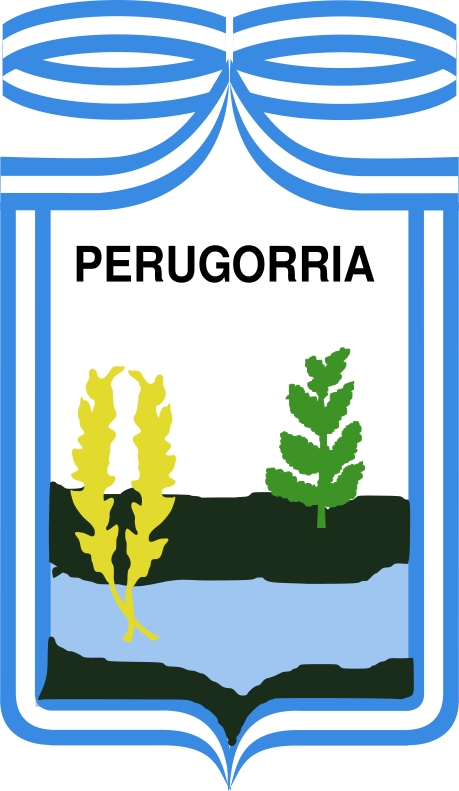 This features a blue and white shield with the name "Perugorria" written in white letters. The shield is adorned with two green plants, one on the left side and another on the right side. These plants are situated above a body of water, which appears to be a lake or river. The overall design gives an impression of a peaceful and natural setting.