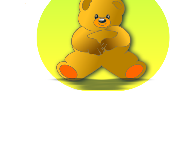 This features a large, cute teddy bear sitting on the floor. It is positioned in the center of the scene and appears to be the main focus of the picture. The teddy bear has an orange nose and is wearing red shoes, adding to its charm. The background consists of a yellow circle that surrounds the teddy bear, giving it a warm and inviting appearance.