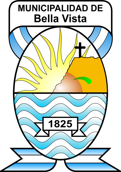 This features a logo for the Municipalidad de Bella Vista, which is located in the province of Corrientes, Argentina. The logo consists of an oval shape with a cross on top and a sun shining through it. Inside the oval, there are two oranges, one placed above the other. The design also includes blue waves surrounding the oval, giving it a unique and eye-catching appearance.