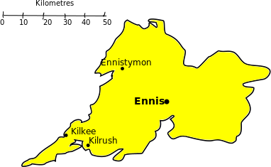 This is a map of the region around Ennis, Ireland. It shows the town of Ennisie and its surrounding area with several other towns and cities labeled on it. The map also includes a scale bar at the bottom to help viewers understand the relative size of the locations. The map is yellow in color, giving it an old-fashioned appearance.