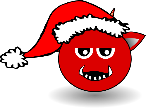 This features a red cartoon devil face with pointy teeth, wearing a Santa hat. The devil's facial expression appears to be angry or displeased, giving it an evil appearance. The Santa hat adds a festive touch to the character, making it appear as if the devil is participating in Christmas festivities despite its menacing demeanor.