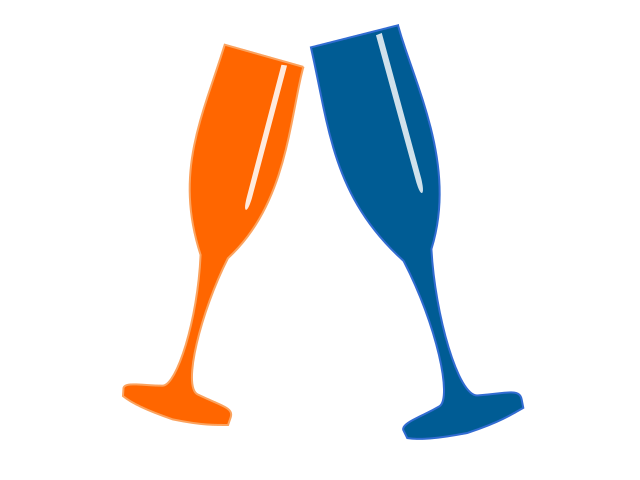 This features two champagne glasses, each with a different color. One of the glasses is orange and the other one is blue. They are placed next to each other in an artistic manner, creating a visually appealing scene. This could be a representation of celebration or a symbolic gesture between two people. The contrasting colors of the glasses add depth and interest to the image, making it stand out as a unique piece of artwork.