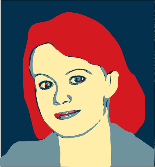 This features a woman with red hair, wearing a blue jacket. She is smiling and appears to be the main focus of the picture. Her eyes are open, and she has a friendly expression on her face. The woman's lips are slightly parted, giving an impression of a relaxed and approachable demeanor. The overall atmosphere of the image seems warm and inviting, with the woman being the central figure in the scene.
