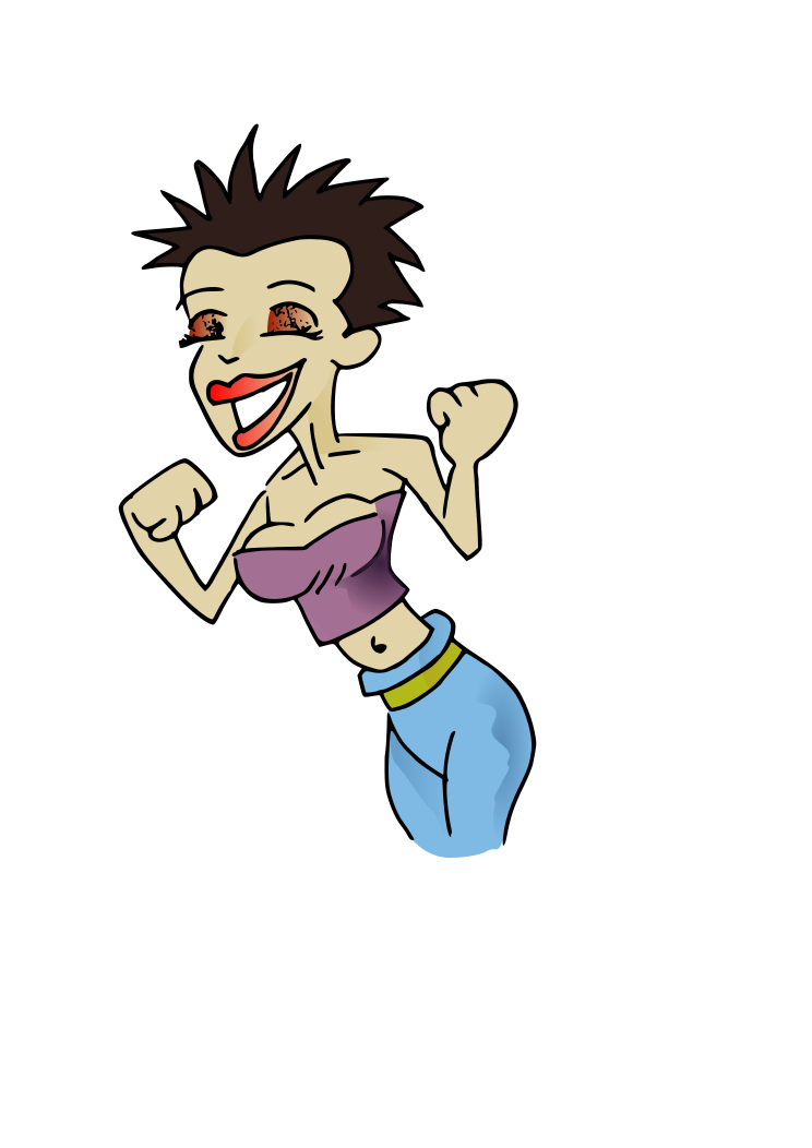 This features a woman with a cartoonish appearance, wearing a purple top and blue jeans. She is posing for the camera with her arms raised in the air, giving off an energetic vibe. Her facial expression appears to be cheerful as she smiles at the viewer. The drawing style of this woman gives it a comical and playful feel, making it an interesting and engaging image.