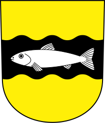 This features a coat of arms with a fish in the center. The fish is positioned on top of a yellow and black background, creating an eye-catching design. The fish appears to be swimming through water, adding depth and movement to the emblem. This unique symbol could represent a specific location or organization, making it an interesting focal point for viewers.