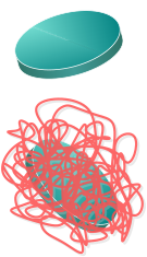 This features a close-up of a red and blue object, which appears to be a pill or tablet. It is placed next to a green circle that resembles a pill bottle cap. The red and blue object has a somewhat messy appearance, with its edges blending into the background. The green circle, on the other hand, stands out against the backdrop, creating a contrasting color scheme in the image.