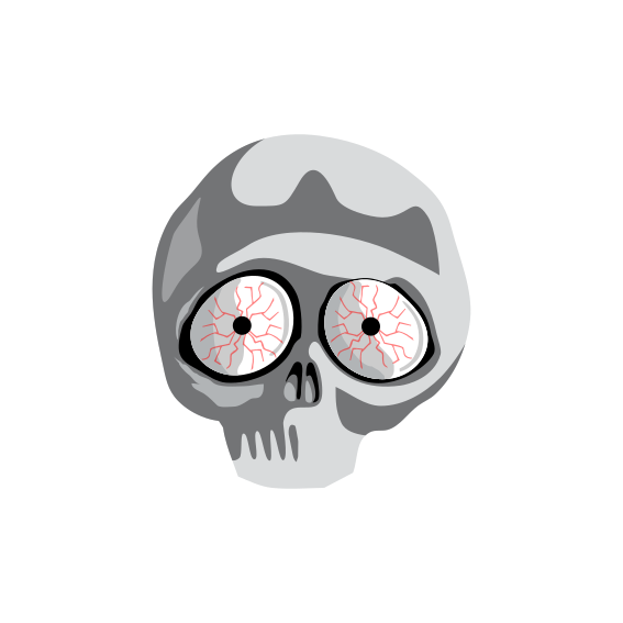 This features a cartoon skull with two large, round eyes that appear to be squinting. The skull is gray in color and has a somewhat nervous expression on its face. It seems as though the skull's eyes are wide open, giving it an animated appearance. This whimsical illustration could be used for various purposes such as decorative artwork or even as part of a children's toy.
