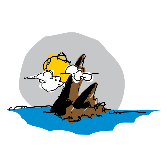 This features a cartoonish drawing of an island with two sharks on it. One shark is located towards the left side, while the other is situated more towards the center-right. Above the island, there are clouds and smoke, giving the scene a dramatic appearance. The sky appears to be cloudy, adding to the overall atmosphere of the image.
