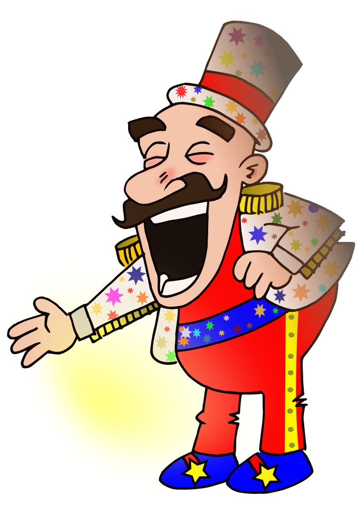 This features a colorful cartoon character dressed in a red suit with stars on it. This character is wearing a top hat and appears to be laughing, possibly due to the funny situation he finds himself in. The character's outfit is adorned with various stars, adding to its festive appearance. Overall, this whimsical image captures the joyful spirit of the circus and the entertaining nature of such performances.