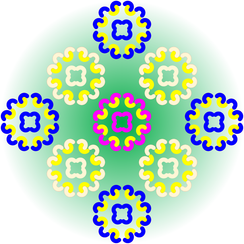 This features a close-up of six colorful, geometric patterns arranged in a circular formation. Each pattern is unique and has a distinct design, creating an eye-catching display. The colors used are predominantly blue, yellow, pink, green, and white, with each color being featured prominently in the patterns. The overall composition of the image gives off a sense of harmony and balance, as the six patterns are evenly spaced around the center of the circle. This artistic arrangement showcases the beauty and intricacy of these geometric designs.