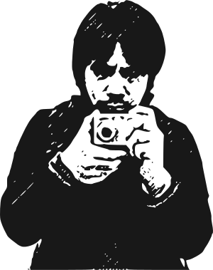 This is a black and white drawing of a man holding a digital camera. He appears to be taking a picture, capturing the moment with his device. The man's face is visible in the foreground, while the rest of his body is obscured by the camera he holds. The drawing showcases the man's focus on the task at hand and highlights the importance of photography in today's society.