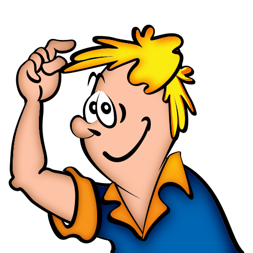 This features a cartoon character with blonde hair, wearing an orange and blue shirt. This character is pointing at his head, possibly indicating that he has just noticed something or is trying to draw attention to it. The character's facial expression appears to be happy and friendly, adding a sense of warmth to the scene. Overall, this cartoon depiction captures a lighthearted moment with a playful twist.