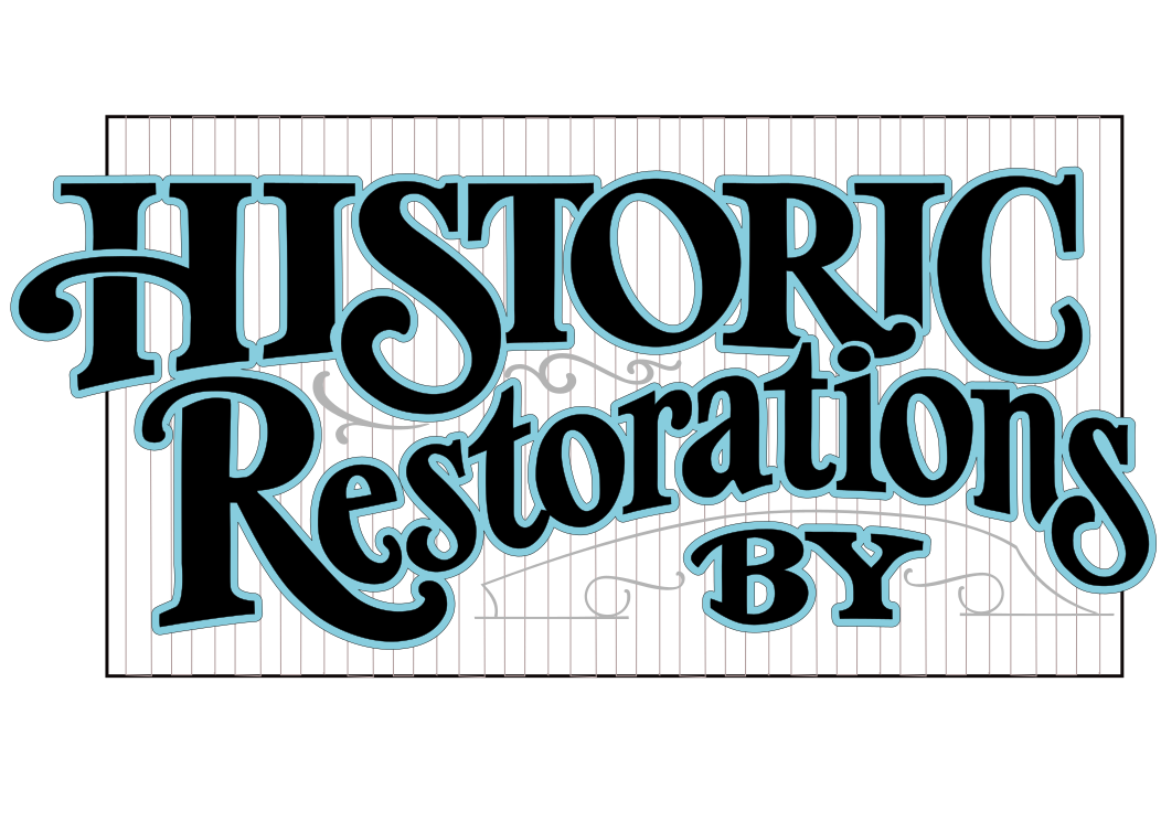 This features a large sign that reads "Historic Restorations by By." The sign is blue and white, with the word "by" written in black. The sign appears to be hand drawn and has been digitally edited using Gimp and Inkscape. It seems to be an advertisement for a business specializing in historic restoration projects.