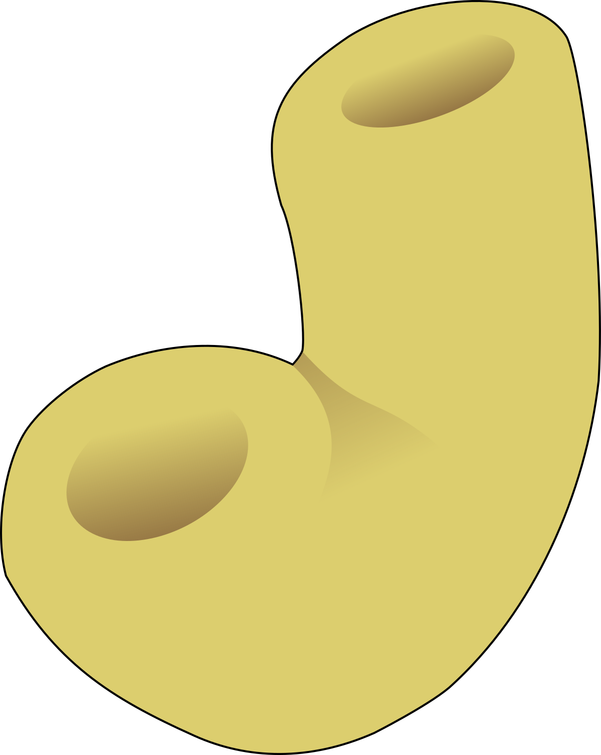 This features a close-up of a yellow macaroni noodle. It is shaped like an elbow and has a black outline, giving it a distinctive appearance. The noodle appears to be shallow on both sides, making it suitable for various dishes or snacks. This particular type of pasta is often used in creative culinary presentations or as a fun food item for children.