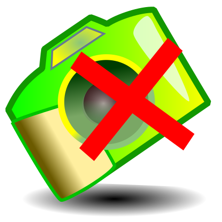 This features a green and yellow circle with a red X through it. This symbol is placed on top of an orange background, creating a visually striking contrast between the two colors. The circle itself appears to be a camera lens, as indicated by its shape and color scheme. Overall, the image conveys a sense of caution or warning, with the red X serving as a bold indicator against the vibrant green and yellow background.