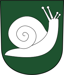 This features a green and white coat of arms, which is adorned with a large snail. The snail is prominently displayed in the center of the emblem, surrounded by a circle of five smaller circles. These smaller circles are arranged around the larger one, creating an intricate pattern that adds to the overall design of the coat of arms. The green and white color scheme gives the emblem a unique and eye-catching appearance.