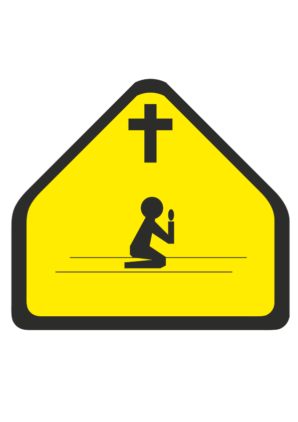 This features a yellow sign with an illustration of a person kneeling down and praying. This sign is likely meant to indicate a designated area for prayer or reflection, possibly within a religious institution or public space. The sign's design includes a cross symbol in the top left corner, further emphasizing its spiritual context. The overall appearance of the sign suggests that it serves as a visual guide for visitors seeking a quiet and peaceful environment for prayer or meditation.