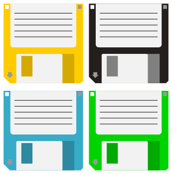 This features a collection of four different colored floppy disks, each with a unique color. These floppies are displayed in various orientations and sizes, showcasing their distinct characteristics. They appear to be arranged in a square formation, with one floppy disk on the left side, another in the middle, and two more on the right side of the image. The colors of these floppy disks include yellow, blue, green, and orange, adding variety and visual interest to the overall composition.
