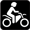 This features a black and white sign with a picture of a person riding a motorcycle. The person is wearing a helmet, indicating safety precautions while riding the bike. The motorcycle itself is prominently displayed in the center of the sign, surrounded by a few other smaller figures. This image could be used to represent a symbol for biking or cycling, possibly as part of a map or transportation guide.