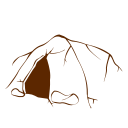 This features a brown cave entrance, with rocks surrounding it. The entrance is partially covered by a blanket or sheet, giving the impression of a tent-like structure. This unique setting creates an interesting visual contrast between the natural elements and human-made materials. The combination of the cave's rocky surroundings and the covering sheet adds depth to the scene, making it appear more intriguing and inviting.