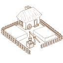This features a small house with a wooden fence surrounding it. Inside the fenced area, there is a well in the garden, adding to the charm of the scene. The house itself appears to be quite small and simple, but its presence adds character to the overall setting.