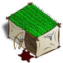 This features a unique shelter made from animal skin and leaves, resembling a hunter's house. Inside the shelter, there is an abundance of grass, giving it a cozy appearance. A bow and arrow are placed outside the shelter, suggesting that this could be a hunting lodge or a place for practicing archery. The combination of natural materials and the presence of the bow and arrow creates a rustic atmosphere in the scene.