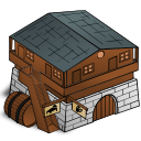 This features a brown wooden building with a gray brick wall. Above the building, there is an illustration of a wood tavern. In front of the building, there are two signs that show pictures of a bed and a drink mug. These signs likely indicate the availability of accommodations and refreshments within the establishment. The overall scene gives off a rustic and inviting atmosphere for visitors to enjoy their time at this location.