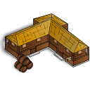 This features a three-dimensional model of an old tavern, showcasing its unique design. The building is made up of several brown wooden pieces that are arranged to create the structure. A prominent feature of this tavern is its yellow roof, which adds a touch of color and warmth to the overall appearance. In addition to the main building, there are two barrels placed in front of it, possibly serving as decorative elements or storage for supplies. The combination of these wooden pieces and the vibrant yellow roof creates an inviting atmosphere that reflects the charm of this old tavern.