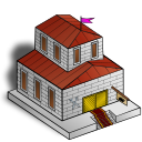 This features a large brick building with a red roof, which appears to be a church or town hall. It has seven windows and golden doors, giving it an elegant appearance. A pink flag is flying on top of the building, adding a touch of color to the scene. The overall design of the building suggests that it may have been constructed in a medieval style, with its stone walls and intricate details.