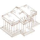 This features a drawing of an old, broken building with two large pillars. The structure appears to be in ruins and has a sense of decay. The drawing is done in black and white, giving it a classic or historical appearance. The overall impression is that the building has been abandoned for quite some time, possibly due to natural disasters or other factors that have led to its deterioration.