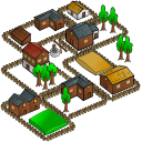 This depicts a charming village scene with several brown buildings and wooden fences. The buildings are scattered throughout the area, creating a cozy atmosphere. There is also an abundance of trees in the vicinity, adding to the natural ambiance of the village. The overall setting appears to be a quaint countryside location, perfect for role-playing games or other imaginative scenarios.
