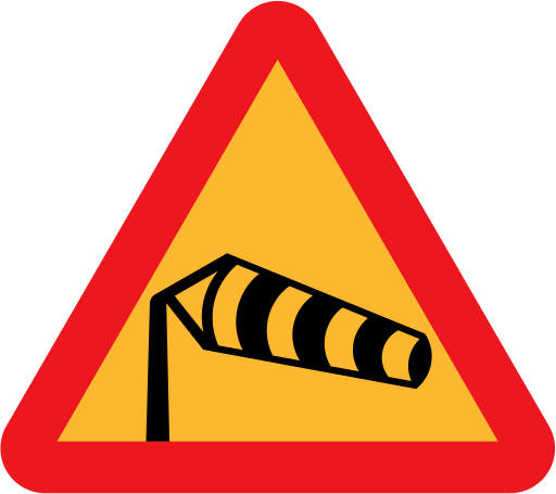 This features a yellow and red sign with an arrow pointing upwards. This sign is likely meant to indicate the direction of wind or possibly warn about strong gusts of wind in the area. The sign has a black outline, making it stand out against its background. It appears to be a simple yet effective way of communicating important information to drivers and pedestrians alike.