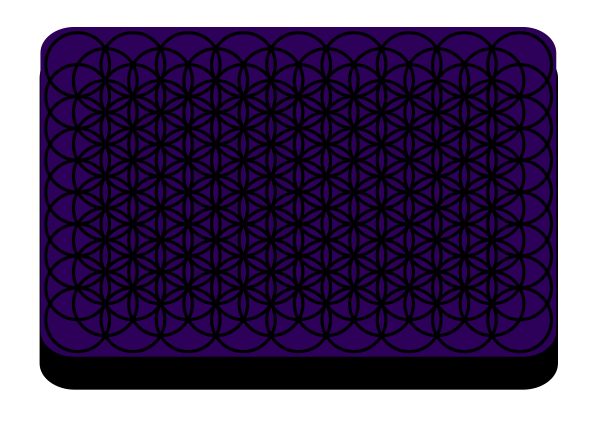 This features a purple and black design on a surface, possibly a laptop or sketchbook cover. This design is reminiscent of the Flower of Life tessellation, which consists of interlocking circles that create an intricate pattern. The color scheme of this particular design includes shades of purple and black, giving it a striking appearance. The overall effect is visually appealing and could be used as a decorative element for personal items or artistic projects.