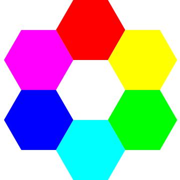 This features a colorful hexagonal design made up of six different colors. These colors include blue, yellow, red, green, orange, and pink. Each color is represented by a unique shape within the larger hexagon structure. The combination of these vibrant colors creates an eye-catching pattern that stands out against its background. This design could be used for various purposes such as decoration or even in the context of art and fashion.