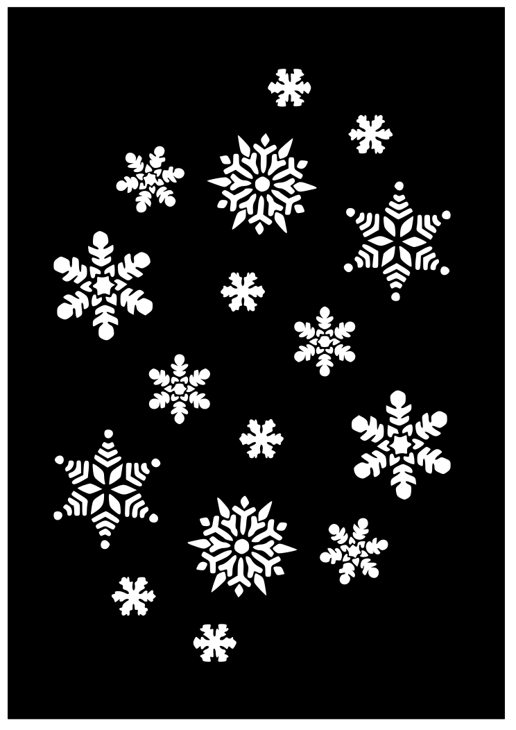 This features a black background with white snowflakes scattered across it. There are sixteen snowflakes in total, each varying in shape and size. They are arranged in different positions on the black surface, creating an interesting visual effect. The snowflakes are intricately designed, adding a touch of elegance to the overall composition. This artistic display could be used as a decorative piece or even as a unique wallpaper design.