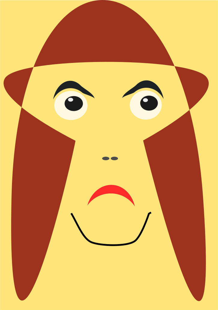 This features a cartoon-like drawing of a face with a frowning expression. The face is wearing a hat, and the eyes are wide open, giving it an angry appearance. The facial features include a nose, mouth, and two ears. The overall design appears to be a mix between a dog's head and a human face, creating a unique and playful character.